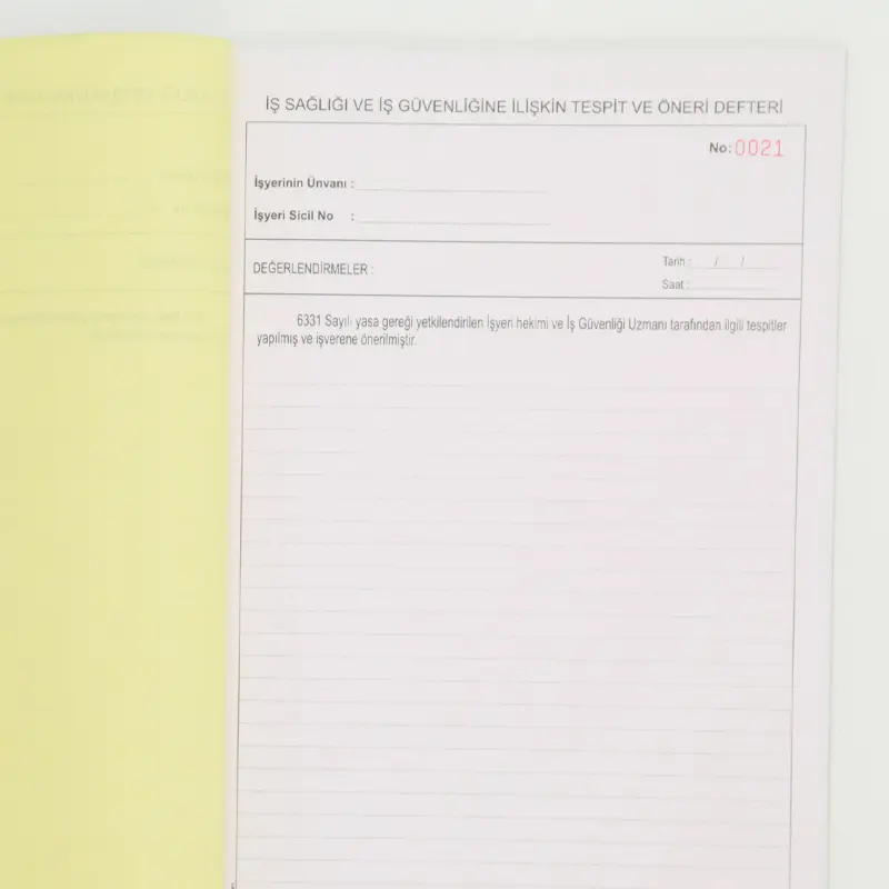 İşyerinizde iş sağlığı ve güvenliği konularında düzenli ve yasalara uygun bir kayıt sistemi kurmak istiyorsanız, Dilman İş Sağlığı ve İş Güvenliği Tespit ve Öneri Defteri ideal bir seçim olacaktır. Kaliteli ciltleme ve uygun sayfa düzeni sayesinde uzun ömürlü kullanım sunar ve kayıtlarınızı düzenli bir şekilde tutmanıza yardımcı olur.