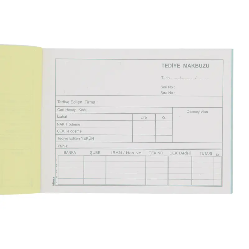 Dilman Tediye Makbuzu, otokopili yapısı sayesinde her ödeme işlemi için otomatik olarak birden fazla kopya oluşturur, böylece hem işletme hem de ilgili taraflar için kayıt tutmayı kolaylaştırır. Düzenli ve şeffaf bir finansal yönetim için bu makbuzu kullanmanızı öneririz.