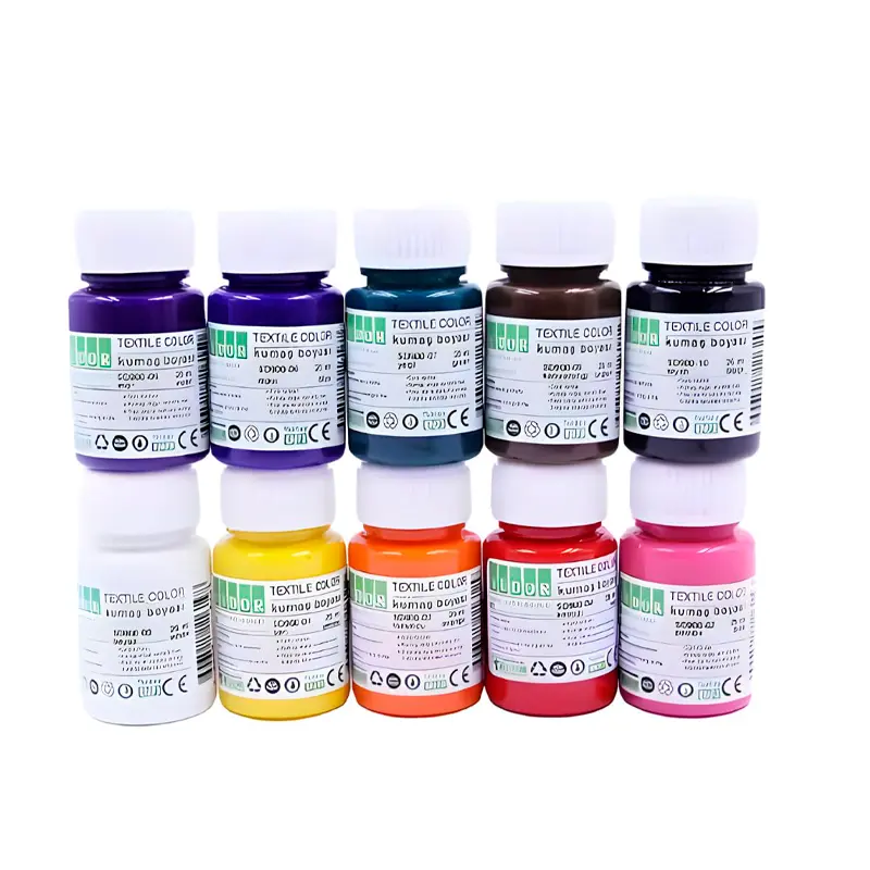 25 ml hacminde 10 farklı canlı renkten oluşan kumaş boyası setidir.