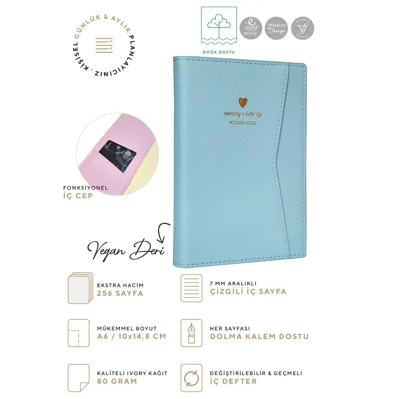 Bu defter, günlük notlar, hatıra yazıları, seyahat anıları veya kişisel planlama için idealdir. Kompakt boyutu sayesinde çantada kolay taşınabilir ve sağlam kapak yapısıyla dış etkenlere karşı dayanıklıdır. Cebindeki ek alan sayesinde kartvizit veya küçük belgeler taşınabilir.