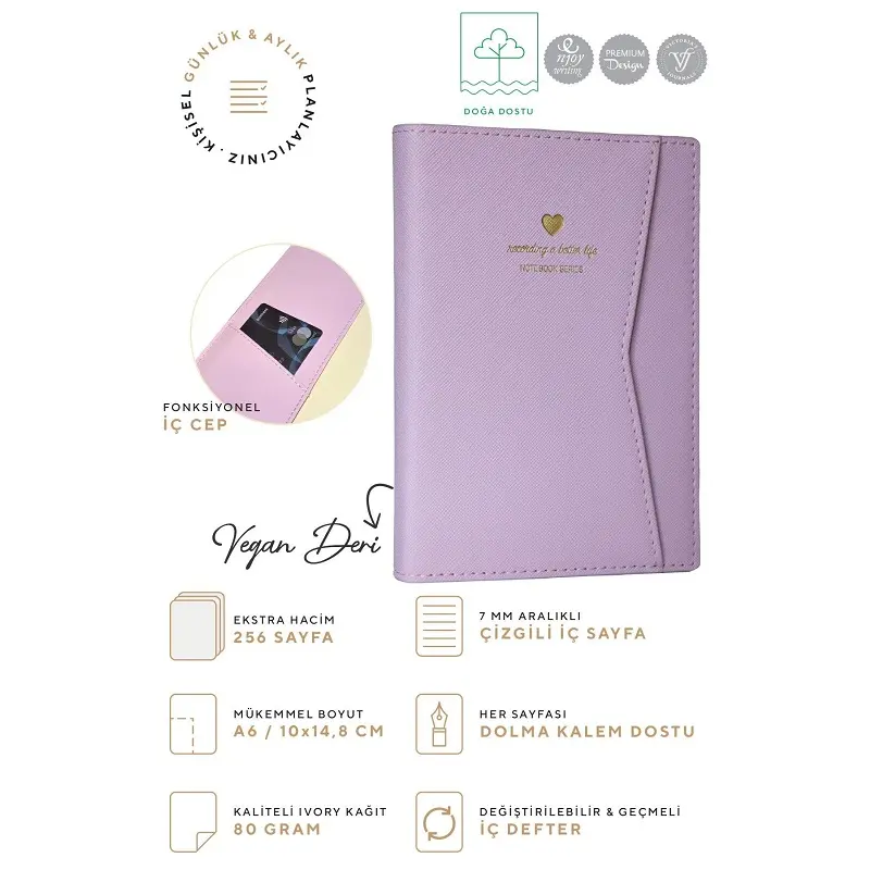 Victoria's Journals Geçmeli ve Cepli Defter, şık ve fonksiyonel yapısı ile dikkat çekiyor. Vegan deri kapak, deftere zarif bir görünüm kazandırırken, çizgili sayfaları düzenli yazılar için mükemmel bir yüzey sunar. Ayrıca, defterin 180 derece açılabilen yapısı yazarken rahatlık sağlar. 80 gram kağıt, dolma kalemle bile rahatça yazılabilir. Bu defter, hem günlük tutmak hem de yaratıcı yazılar yazmak isteyenler için mükemmel bir seçenek. Eğer estetik ve fonksiyonelliği bir arada arıyorsanız, bu defter tam size göre