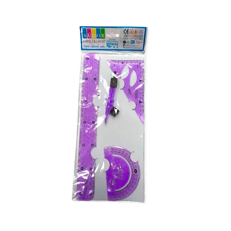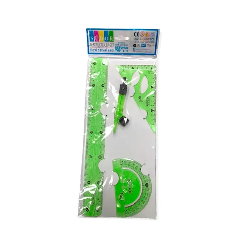 Set İçeriği: 4 parçadan oluşur; 30 cm esnek cetvel, pergel, gönye ve pergelli cetvel içerir.