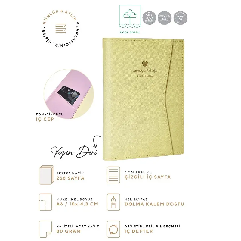 Bu defter, zarif tasarımı ve pratik özellikleriyle hem estetik hem de işlevsellik arayanlar için ideal bir seçimdir.