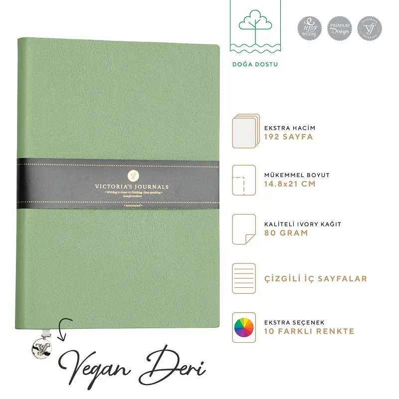 Bu defter, yazmanın keyfini çıkarmak isteyenler için mükemmel bir seçimdir. Yüksek kaliteli vegan deri kapak, zarif bir görünüm sunarken, çizgili sayfalar düzenli yazılar yazmanıza olanak sağlar. Özellikle dolma kalem kullananlar için ideal olan bu defter, 180 derece açılabilen tasarımı sayesinde rahat yazma deneyimi sunar. Hem günlük tutanlar hem de yaratıcı projeler için kullanıma uygundur. Ayrıca, sade ve şık tasarımıyla hediye olarak da harika bir alternatif olabilir.